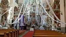 The most famous cultural object in Tytuvenai is the church and monastery architectural ensemble from the 17th century. Spacious yard, surrounded by closed Lithuanian gallery, with a chapel with steps in the center, by which those who come to pray go up. In a monastery in authentic monks’ cells many fresco paintings are made. Splendid chapel of Šiluva is built upon the project of well-known architect Antanas Vivuliškis. Here there is also an attractive old market square with several old wooden houses surrounding it. The numerous pagan memorials include Bridvaišis, Šiauleliai, Pašakarnėlis and Kudinis castle hills, Kuršis, Debeikis, Rinkšelis tumuluses (burial mounds), as well as former shrine of pagans – Saint Jurgis Hill.[4]
