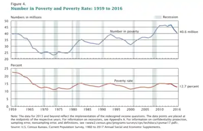 The U.S. economy experienced a serious economic downturn during the Great Recession, defined as lasting from December 2007 to June 2009. However, real GDP regained its pre-crisis (late 2007) peak by 2011,[75] household net worth by Q2 2012,[76] non-farm payroll jobs by May 2014,[77] and the unemployment rate by September 2015.[78] The United States ranked the 41st highest in income inequality among 156 countries in 2017,[79] and the highest compared to the rest of the Western world.[80] Each of these variables continued into post-recession record territory following those dates, with the U.S. recovery becoming the second-longest on record by April 2018.[81]