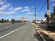 In 1953, the portion of US 202 along the Concord Pike between the Wilmington border and Murphy Road was widened into a four-lane divided highway.[17] In September 1953, construction began to widen the portion of US 202 between Murphy Road and Talleyville into a four-lane divided highway. This widening was completed in October 1954.[18] In 1955, recommendations were made to widen US 202 between Talleyville and the Pennsylvania state line.[19] The divided highway was extended north from Talleyville to the Pennsylvania state line in 1957.[20][21]
