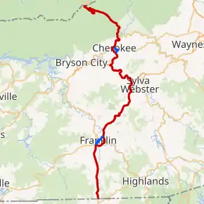 Upon crossing the state line from Georgia, US 23/US 441 enter the Nantahala National Forest. The concurrent routes head north through a pair of small communities before intersecting US 64 in Franklin. US 23/US 441 turn east, briefly overlapping US 64 southeast of Franklin before separating from the route and continuing to the northeast through the Cowee Mountains. After passing Dillsboro, US 23/US 441 intersect US 74 (Great Smoky Mountains Expressway); US 23 splits east towards Waynesville, while US 441 joins US 74 westbound towards Bryson City. After traversing 7 miles (11 km) along the northern banks of the Tuckasegee River, US 441 splits from US 74 and continues north into the Qualla Boundary, along Beloved Man Dr Jerry Wolfe Highway.[2][3][4] In Cherokee, US 441 shares a short one-half-mile (0.80 km) concurrency with US 19, then continues north along the west bank of the Oconaluftee River. After entering the Great Smoky Mountains National Park, US 441 connects to the southern terminus of the Blue Ridge Parkway. Known officially in the park as Newfound Gap Road, US 441 traverses northwesterly through park until it reaches Newfound Gap at the Tennessee state line.[1]