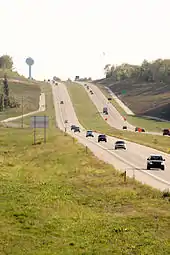 US-59 is a 210-mile-long (340 km) highway which runs from south to north in eastern Kansas. It enters the state from Oklahoma south of Chetopa and passes through Parsons, Ottawa, Oswego, Moran, Garnette, and Lawrence. The route leaves Kansas for Missouri by crossing the Missouri River at Atchison. Most of the route climbs the cuestas of the Osage prairie,[2] while north of the Kansas River, it cuts through the glaciated region.[3]