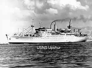 The hull of the USNS Upshur was laid down on September 1, 1949 by the New York Shipbuilding Corporation in Camden, New Jersey as the SS President Hayes. Designed in 1947 as a passenger-cargo ship for the American President Lines' post-World War II replacement program,[1][4] before she was completed in her civilian configuration, she was requisitioned by the U.S. Navy at the outbreak of the Korean War and converted for troop and dependent transport.[3][4] Reassigned to the US Navy and renamed USNS Upshur, she served the Military Sea Transportation Service from 1952 to 1973.[1] Over her years of service she performed many routine missions, carrying military members and their families safely across the seas in an era when air travel was uncommon, as well as special missions, such as the emergency evacuation of military families from Guantanamo Bay Naval Base in 1962.[5]