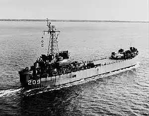 USS LST-209 was an LST-1-class tank landing ship built for the United States Navy during World War II. Like most of the ships of her class, she was not originally named, and known only by her designation. From June to August 1951 she served a stint as a part of the Military Sea Transportation Service (MSTS), manned by a civilian crew, and renamed USNS T-LST-209. She was recommissioned under her original name 24 August 1951, and renamed USS Bamberg County (LST-209) on 1 July 1955. She was named for Bamberg County, South Carolina, the only U.S. Naval vessel to bear the name.
