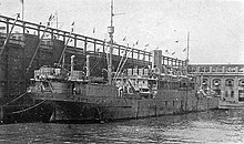 Black Arrow was converted by the Morse Dry Dock and Repair Company of Brooklyn between 17 January and 15 March 1919, at a cost of $170,938[lower-alpha 5]—in the process becoming the first ship raised by the Morse Company's new floating dock, the largest of its type in the world.[41] While still undergoing conversion, the ship was commissioned into the U.S. Navy on 27 January as USS Black Arrow (ID-1534), with Lieutenant Commander Walter S. Lynch, USNRF, placed in command.[5] After conversion, the ship had a passenger capacity of 85 officers and 1,510 enlisted men,[40] and a crew complement of 21 officers and 96 enlisted men,[42]