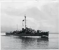 The Charles J. Kimmel (DE-584) was a Rudderow class destroyer escort serving in the US Navy from 1944 through 1947. She served in both the Atlantic and Pacific theaters of World War II. The Kimmel was laid down by Bethlehem Steel in Hingham MA on 1 December 1943 and launched on 15 January 1944, she was commissioned 20 April 1944 Decommissioned 15 January 1947, stricken 30 June 1968 and ultimately sunk as target off California, 13 November 1969.[1]