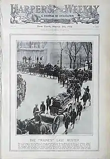The Birmingham arrived at the Washington Navy Yard at 10:45 A.M. on March 20. At noon, the coffins were removed from ship and taken to the State, War, and Navy Building, one block east of the White House. A 200-man cavalry unit from Fort Myer carried the coffins aboard caissons. An honor guard consisting of the Third Battalion of the Third Field Artillery;[209] a battalion of bluejackets from the North Carolina; a battalion of bluejackets from the Birmingham; a battalion of Marines from Norfolk, Virginia; 200 Army engineers from Fort Washington, Maryland; a battalion of Marines from Fort Washington; a battalion of bluejackets from the Washington Navy Yard; a battalion of bluejackets from Baltimore, Maryland; and 50 members of the District of Columbia Naval National Guard accompanied the dead. The naval band from the USS Mayflower (PY-1) accompanied the honor guard, playing funeral dirges.[213] Tents were erected on the south side of the State, War, and Navy Building, and the caissons bearing the flag-draped coffins lined up beneath the tents at about 2:00 P.M.[207][213]
