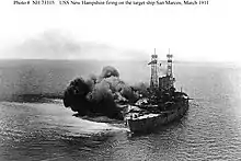 New Hampshire conducted training exercises in the Atlantic and Caribbean through late 1910. On 1 November that year, she steamed out of Hampton Roads with the Second Battleship Division for a visit to Europe. There, the ships stopped in Cherbourg, France and Weymouth, the United Kingdom. The Division departed Weymouth on 30 December and returned to the Caribbean for training, before proceeding to Norfolk on 10 March 1911.[3] On 21–22 March, New Hampshire conducted gunnery training with the target ship San Marcos—the old battleship Texas—in Tangier Sound in Chesapeake Bay. Over the course of the two days of firing, New Hampshire inflicted severe damage to the old ship, sinking her in shallow water. A cursory inspection of the wreck noted that the interior of the ship above the waterline was destroyed and that she had been holed multiple times below the waterline.[5]