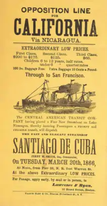 After her purchase from the Navy, Santiago de Cuba was registered as a civilian passenger ship.[8] Her interior was rebuilt to convert her from warship to passenger liner. Her first sailing for the Central American Transit Company left New York for San Juan de Nicaragua on 20 November 1865. She made one round trip per month and did good business. She reached New York on 7 June 1866 with 554 passengers and $125,000 of gold on board.[37] On 8 July 1866 she returned to New York with 407 passengers.[38] This pleasant routine was broken on Saintiago de Cuba's September sailing. She left New York on 29 September 1866. Four days into the trip she was struck by a storm with high winds and heavy seas. Two passengers and two crew were washed overboard and lost. The stem, rudder, and deck house were damaged and the ship was forced to turn back to New York for repairs, where she arrived 7 October 1866.[39] The ship was repaired and resumed her commute between New York and San Juan de Nicaragua in November 1866.