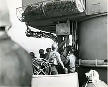 Kota Tjandi, a former Dutch ship called Karin by her Kriegsmarine crew, was brought to a halt by shots fired across her bow by the two American warships. Just as a boarding party from Eberle arrived alongside, powerful time bombs, planted just before Karin's lifeboats got underway, exploded. Eleven sailors of the boarding party were killed, but one of Savannah's boat rescued three men from the water. Savannah took 72 German sailors on board, and quartered them below decks as prisoners-of-war.[4] Savannah returned to New York Harbor on 28 March 1943, where she was overhauled in preparation for her next assignment in the Mediterranean Sea.[4]