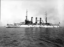 Virginia was laid down at the Newport News Shipbuilding on 21 May 1902 and was launched on 5 April 1904. She was commissioned for active service on 7 May 1906.[2] Captain Seaton Schroeder was the ship's first commander. Virginia began a shakedown cruise in Chesapeake Bay, Virginia, to Newport, Rhode Island, then to Long Island, New York, before arriving in Bradford, Rhode Island on 9 August. Sea trials followed off Rockland, Maine,[3] in which the ship recorded an official speed of 19.734 knots (36.547 km/h; 22.709 mph).,[4] before proceeding to Oyster Bay, Long Island, where she was reviewed by President Theodore Roosevelt from 2 to 4 September. The ship returned to her shakedown cruise. In the meantime, a revolution had begun in Cuba against President T. Estrada Palma, who requested United States intervention to protect his government. Virginia was sent on 15 September to protect Havana from attack; she remained there from 21 September to 13 October, when she returned to Sewell's Point, Virginia.[3]