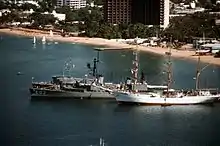 Vogelgesang was decommissioned and stricken from the Naval Vessel Register on 24 February 1982, transferred to Mexico and renamed Quetzalcoatl (E-03). In 1993, the ship had a single Bofors 57 mm gun mounted in "B" position, between the forward 5 inch mount and the ship's bridge.[1] Also during that year, the ship was renamed Ilhuicamina with the pennant number E-10,[2] although by 2002 the ship had reverted to the name Quetzalcoatl.[1] In 1994,[lower-alpha 1] the ASROC launcher and anti-submarine torpedo tubes were removed.[2] In 2001, the ship again changed Pennant number, to D 101.[1] She was decommissioned by the Mexican Navy in late 2002. On 24 November 2006, the ship was scuttled to form an artificial reef. Her main tripod mast is on display in Mexican Pacific Fleet headquarters, Mexico.