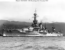 On 2 August, Wyoming was in Balboa in the Canal Zone, where she picked up Rear Admiral Rodman and a commission traveling from Peru back to New York. She arrived in New York on 19 August and rejoined the Atlantic Fleet. There, she became the flagship of Admiral Hilary P. Jones, the commander of the Atlantic Fleet. Wyoming spent the next three and a half years on the normal routine of winter fleet exercises off Cuba, followed by summer maneuvers off the east coast of the US. Throughout the period, she served as the flagship of Vice Admirals John McDonald, Newton McCully, and Josiah McKean in the Scouting Fleet. In the summer of 1924, she conducted a midshipman training cruise to Europe, and stopped in Torbay, Great Britain, Rotterdam in the Netherlands, Gibraltar, and the Azores.[2] In January and February 1924, the Navy conducted Fleet Problem II, III, and IV concurrently. During the FP III maneuvers, Wyoming, her sister Arkansas, and the two Florida-class battleships stood in for the new Colorado-class battleships.[10] During the FP IV portion of the maneuvers, Wyoming served in the "Blue" force, which represented the US Navy. She was attacked by "Black" aircraft, but the umpires judged Wyoming's anti-aircraft fire and the escort fighters provided by Langley to have effectively defended the fleet.[11]