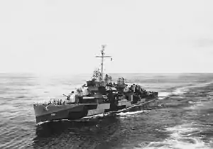 On the 17th, as a result of the submarine sightings of the Japanese fleet moving toward the Marianas, Yarnall and 20 other destroyers were detached from direct support for the invasion and ordered to screen the fast carriers. Yarnall joined TG 58.7, Rear Admiral Willis A. Lee's hastily composed battle line, in preparation for what would be the Battle of the Philippine Sea. Her first antiaircraft combat was at 05:15 on 19 June when a Mitsubishi A6M "Zeke" tried to bomb Stockham (DD-683) and then began a strafing run on Yarnall. She engaged the attacker with three guns of her main battery; as the plane closed on the destroyer's port quarter it exploded and splashed into the sea, Yarnall's first victory.