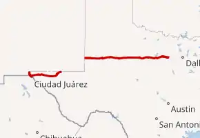 U.S. Highway 180 (US 180) is a US highway that runs from Valle, Arizona, to Hudson Oaks, Texas. A child route of U.S. Route 80, the Texas portion of U.S. 180 consists of two distinct segments. Separated by an approximately 105 mile stretch of roadway travelling through southeast New Mexico, the first segment travels through far west Texas from the New Mexico border near El Paso to the New Mexico border approximately 25 miles west of Carlsbad, New Mexico. The second segment begins on the Texas state line between Hobbs, New Mexico, and Seminole and travels east across the lower Panhandle and Cross Timbers regions, passing through the towns of Lamesa, Snyder, Albany, and Breckenridge. The terminus of the second segment, which is also the highway's eastern terminus, is at an interchange with Interstate 20 (I-20) in Hudson Oaks, between Weatherford and Fort Worth.