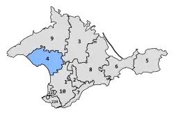 Ukraine's 4th electoral district is a Verkhovna Rada constituency in the Autonomous Republic of Crimea. Established in its current form in 2012, it contains the cities of Yevpatoria and Saky, and the surrounding Saky Raion. The constituency is home to 176,570 registered voters, and has 136 polling stations. Since the Annexation of Crimea by the Russian Federation in 2014, the seat has been vacant.