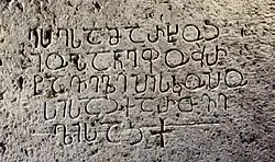 The Umm Leisun inscription (Georgian: უმ ლეისუნის წარწერა, romanized: um leisunis ts'arts'era) is the Old Georgian limestone tombstone slab five-line[1] inscription written in the Georgian Asomtavruli script which was discovered in 2002, after the renewal of 1996[2] excavation, at a Georgian monastery of the Byzantine period, in the neighborhood of Umm Leisun, in the southern part of Sur Baher, 4.5 km southeast of the Old City of Jerusalem,[3] found in a burial crypt under the polychrome[4] mosaic floor.[5]
