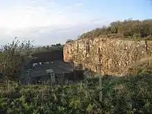 The site was purchased by the council in 1932 and by 1939 they controlled 100 acres of surrounding land. By 1948 the quarry face had extended to a length of 900 feet and was 110 feet deep. To provide work during times when it was too wet for quarry operations, a precast concrete plant was established.[1][3] In 1932 the quarry employed 118 men.[4] In 1971 the quarry was producing a quarter million tons of stone per annum.[5]