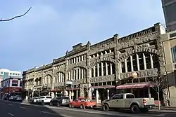 The Union Block a 2-story, brick and sandstone commercial building with 126-ft frontage on Idaho St and 120-ft depth between Idaho and Bannock Sts, constructed by contractors Walker & Jensen in 1901. The building includes space for five storefronts, and the second floor was designed for 21 offices and for a 55-ft by 120-ft meeting room and music hall.[3]
