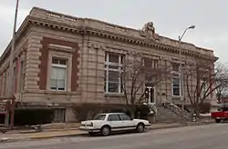 The U.S. Post Office, now known as the Springer Cultural Center, is a historic government building located at Randolph and Church Streets in Champaign, Illinois. Built in 1905, the building originally served as Champaign's post office. The office of Supervising Architect James Knox Taylor designed the Beaux-Arts building. The brick building features extensive limestone and terra cotta ornamentation. The front facade has four pairs of Ionic pilasters separating the entrance and two sets of windows. A frieze reading "UNITED STATES POST OFFICE" and a dentillated cornice run above the pilasters. A balustrade runs along the front edge of the roof; a large scrolled cartouche marks the center of the balustrade. In 1966, the post office was converted to a federal building.[2]