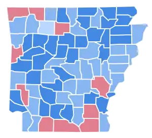 However, in the Delta and south of the state sufficient backlash against black civil rights occurred for Goldwater to claim six counties in those regions from the Democrats.[10] Of these, only state namesake Arkansas County had ever been carried by a Republican since the McKinley era.[lower-alpha 1] Ashley County and Drew County voted Republican for the first time since James G. Blaine in 1884,[11] Union County for the first time since Reconstruction, while Goldwater was the first Republican to ever carry Columbia and Howard Counties.[10]