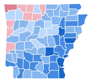 As of the 2020 presidential election, the 1996 election is the last time that a Democratic presidential nominee has won in Arkansas; the state has gone Republican in each subsequent presidential election, starting in 2000, and has seen a mass of counties bleed to the GOP in every election since. This is also the last election in which Washington County, Columbia County, Arkansas County, Faulkner County, Union County, Garland County, Johnson County, Howard County, Calhoun County, Saline County, Perry County, Miller County, Van Buren County, Montgomery County, Madison County, Pike County, Logan County, White County, Lonoke County, Pope County, Independence County, Cleburne County, Yell County, Conway County, Franklin County, Grant County, Sharp County, Sevier County, Marion County, Stone County, Fulton County, Scott County, Prairie County, and Cleveland County voted for a Democratic presidential candidate.[2]