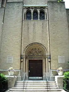 UNMC is an example of Romanesque Revival architecture and was designed by Charles Collins and Francis Allen, architects of the Riverside Church in New York City.[2][5] The four-story building, a contributing property to the Sixteenth Street Historic District, features a stained-glass window and a stone tower that reaches a height of 98 feet (30 m).[1][6]