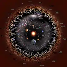 The universe (Latin: universus) is all of space and time[lower-alpha 1] and their contents,[10] including planets, stars, galaxies, and all other forms of matter and energy. The Big Bang theory is the prevailing cosmological description of the development of the universe. According to this theory, space and time emerged together 13.787±0.020 billion years ago,[11] and the universe has been expanding ever since. While the spatial size of the entire universe is unknown,[3] the cosmic inflation equation indicates that it must have a minimum diameter of 23 trillion light years,[12] and it is possible to measure the size of the observable universe, which is approximately 93 billion light-years in diameter at the present day.