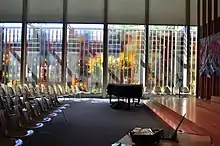 The design goal of the University Unitarian Church was to "be a place where people may gather for worship, where children may be taught to work and pray, and where the community is enriched by its presence."[12] The building is recessed away from 35th NE due to the high usage of the street. A small courtyard is placed at the base of the western wall to further serve as a buffer to the street, which is highly used by the community.[16] The building embraces this courtyard, indicative of Kirk's desire for site integration.[17] The west façade of the University Unitarian Church exposes its structure and adheres to straight lines, typical of Kirk's work.[18] The large structural vertical elements support detailed glass and screens.[11] The detailed woodwork of the screens is another typical characteristic of Kirk's designs.