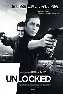 Unlocked is a 2017 action thriller film directed by Michael Apted, written by Peter O'Brien, and starring Noomi Rapace, Orlando Bloom, Michael Douglas, John Malkovich and Toni Collette. It was Apted's final film before his death in 2021. It was released in the United Kingdom on May 5, 2017, by Lionsgate.