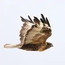 This is the largest buzzard and the largest member of the Buteo in the world based on total length and wingspan. However, it is roughly equaled in bulk by the North American ferruginous hawk (Buteo regalis), which is also only marginally smaller going on mean standard measurements. The total length of the upland buzzard is 57 to 72 cm (22 to 28 in) and wingspan is 143 to 161 cm (4 ft 8 in to 5 ft 3 in).[2][5][6] Body mass is known to range from 950 to 1,400 g (2.09 to 3.09 lb) in males, with three averaging 1,168 g (2.575 lb), and from 970 to 2,050 g (2.14 to 4.52 lb) in females, with seven averaging 1,581 g (3.486 lb).[2][7] The average size of 14 upland buzzards in the Tibetan Plateau was 639 mm (25.2 in) in length, including a tail of 289 mm (11.4 in), a smallish culmen of 30 mm (1.2 in), a tarsus length of 86 mm (3.4 in) and a body mass of 1,557 g (3.433 lb).[8] The Upland buzzard is conspicuously large for a Buteo, with long wings and a relatively long tail, and fairly eagle-like compared to related species. There are both pale and dark morphs. The pale morph is generally beige and earthen dark brown in colour. This morph bears a lightly marked whitish colour with a variable ochre wash to the head and nape with the chest generally appearing purest whitish. On pale morphs, the whitish chest is contrasted with dark brown areas widely but irregularly distributed across the lower breast and abdomen. The flanks and belly are similarly dark, while the tail is greyish with dark sides and prominently dark bands, with a heavier sub-terminal band. The coverts on perched buzzards can appear lighter brown than elsewhere. In flight on pale morphs, the major coverts are variable, appearing somewhat streaky brown, contrasted with a very strong blackish patagium mark. The flight feathers appear whitish with a variable amount of dark barring leading into the blackish wingtips and trailing edges. Dark morph upland buzzards are almost entirely solid black-brown throughout the body. with the flight feather pattern similar to pale morph but darker apart from the flight feathers.[2][9][10] The call of the upland buzzard is a prolonged nasal mewing, not dissimilar to that of the common buzzard (B. buteo), although it is said to vocalize less than that species.[2] The "trousers" are heavily feathered brown, often covering at least three-quarters of the legs. Despite individual variations, these buzzards are more insulated on their legs than other Buteo, apart from the ferruginous hawk and rough-legged buzzards (B. lagopus) which both have feathering extending along their tarsi.[2][11]