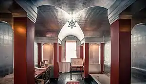 Upton is a long low house built of local yellow sandstone. It was considerably expanded from 1927 to 1929 for the 2nd Viscount Bearsted by Morley Horder who retained the Carolean style appearance of the exterior while introducing some Art Deco elements in the interior, particularly in the bathroom for Lady Bearsted, where the walls are covered in aluminium leaf. The style of interiors at Upton has been described by art critic Osbert Lancaster as Curzon Street Baroque.