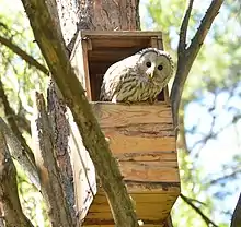 Potential nesting sites include large natural holes in trees, cavities left by large branch that have broken off, hollow trunks where canopies have been broken off (or "chimney stacks"), fissures or holes in cliffs or between rocks and holes in buildings.[4][5] Tree crags and stumps used preferentially in central and eastern Europe are quite often common birch (Fagus sylvatica) or occasionally common oak (Quercus robur).[31][165] Also Ural owls may regularly use stick nests of larger birds such as various accipitrids, in particular those built by goshawks and buzzards, as well as black stork (Ciconia nigra) nests, common raven (Corvus corax) nests and squirrel dreys, though dreys and nests of smaller birds such as sparrowhawks and crows may present risk of regularly collapsing as they may be overly small and perhaps flimsily built.[4][5] A highly unusual nest site in terms of regional habitat was recorded in Slovakia, in the Východoslovenská Plains, a lowland floodplain, within an old buzzard nest.[173] Nest can be in the vicinity of small towns, as was recorded in southern Sakhalin, so long as appropriate habitat and prey access is available in the region.[174] In one case in Norway, a Ural owl utilized a hole in a common aspen (Populus tremula) in the same tree where common mergansers (Mergus merganser) were using a different hole.[175] In several parts of their range they may make use of nest boxes, with the trend of nest box placement beginning and being perhaps most persistently used in Fennoscandia.[5] Large nest boxes with an opening of about 16 cm (6.3 in) in diameter are preferred by the species.[5] Elsewhere, about 29% of nest boxes set out in Slovenia are known to have been used.[165] In Russia’s Altai Krai, Biya River area between 2010 and 2012, 15.2-48.9% of nest boxes that were erected were used with annual variation explainable by cycles of primary food sources.[9] In Samara Oblast of 74 nest boxes set in 4 study plots by 2009, 41.9% were used by Ural owls (with about 14.9% used by various other animals). In Samara, about 20.6% of Ural owls pairs in the study block still used natural nest sites despite the availability of nest boxes.[172] Nearby to the prior site, in the woodlands outside of Biysk of the Altai Krai, 8 territories were detected with all 6 nest found in nests built by accipitrids.[9] Use of 15 total nest boxes in Akademgorodok, Russia over three study years varied wildly based presumably on prey population cycles with anywhere from 0% to 50% used annually.[176] Incidental benefit has been shown for several beetle species and sometimes other insects that have come nest in the substrate of Ural owl nest boxes, even in areas where the invertebrates are rare or endangered.[177][178][179]
