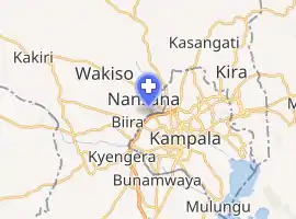 The hospital is located in Nansana in Wakiso District off of the Kampala–Hoima Road, about 10 kilometres (6 mi) northwest of the central business district of Kampala, Uganda's capital city.[2] This is approximately 6 kilometres (4 mi) by road, northwest of Mulago National Referral Hospital.[3]