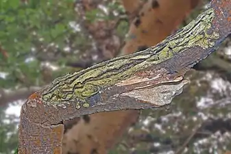U. sikorae has flaps of skin, running the length of its body, head and limbs, known as the dermal flap, which it can lay against the tree during the day, scattering shadows, and making its outline practically invisible.[10] Additionally, the gecko has a limited ability to alter its skin colour to match its surroundings.[11]
