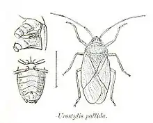 This family has about 100 species, with distribution limited mainly to eastern Asia. Urostylidids are 4 to 15 mm and somewhat longer than broad with elongated legs, three tarsal segments, and a small head. The antenna has 5 segments of which the first is longer than the head. The base of the antenna has broad tubercles and has a ringed appearance. The simple eyes or ocelli, when present (Urolabida lacks ocelli[2]), are very close to each other. They show a wide separation between the hind and mid coxae on the underside. Other important family characters are the presence of a structure for stridulation, the stridulitrum on the first anal vein of the hind wing, and bristles on the claws. The female genital structure has nine gonocoxites that form a M or W-shaped sclerite.[3] They suck plant sap.[4][5] The male reproductive anatomy suggests close affinities to the Tessaratomidae subfamily Natalicolinae. The spermatheca has two pump flanges in two genera which is a feature found also in the Aradidae and Leptopodidae. Thus the phylogeny of the group is unclear but lies within the Pentatomoidea.[6] In the past the family was divided into two subfamilies, but one group, the Saileriolinae, has since been suggested as a distinct family, Saileriolidae, by at least two studies. The position of Saileriolidae within the Pentatomoidea is still unclear.[3][7]