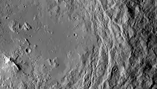 Urvara /ɜːrˈvɛərə/[1] উর্বর is the third-largest confirmed crater on Ceres after Kerwan and neighboring Yalode. Urvara means fertile. It is named after the ancient Indo-Iranian personification of fertility (plants in the Avesta, fertile fields in the Rig Veda).[2] It has a central peak, and a number of unexplained ridges intersect it.