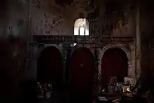 The church is sparsely lit by two windows, one each in the apse and west wall. Both the internal walls and iconostasis are covered with two layers of now faded frescoes, the earlier dated to the 10th century and the second layer painted over in the 13th century. The ambulatory was also frescoed, but only fragments of its 13th-century paintings survive. The exterior bears scarce decorative stonework. The west façade has a cross, sculpted in relief, and a slab with a four-line Georgian inscription, in a mixed khutsuri-mkhedruli script, paleographically dated to the 11th century and mentioning a female donor, named Gurandukht. The church also contains several scratched graffiti, dated from the 10th century into the 18th.[2]