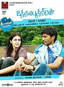 Uthamaputhiran (English: Ideal Son) is a 2010 Indian Tamil-language romantic comedy film directed by Mithran Jawahar. A remake of the 2008 Telugu film Ready, it stars Dhanush and Genelia, reprising her role from the original version;[1] the supporting cast includes Vivek, K. Bhagyaraj, Ashish Vidyarthi and Jaya Prakash Reddy (who was also part of the original film) among others with Shriya Saran in a cameo. The film received positive reviews from critics, ended up as a commercial success among 2010 Deepavali releases along with Mynaa.[2][3] The film was dubbed into Hindi as Rakhwala No. 1 in 2012,.[4]