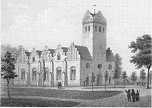 Following several fires in Växjö during the late 18th and early 19th century, concerns were raised about the fire safety of the cathedral. The roof was considered to be particularly at risk. The bishop, writer Esaias Tegnér, together with county governor Count Carl Mörner, decided to hire architect Carl Georg Brunius to draw up plans for a reconstruction.[30] Brunius proposed a radical change to the exterior of the church: placing the nave and choir under a low gable roof while at the same time replacing the roof over the aisles with several gable roofs in an angle to the nave, and ending in stepped gables. The tower spire and the choir were also to be decorated with stepped gables. The inspiration for this design came from German architecture and medieval city churches in Scania.[30][31] Despite opposition from the government agency for the administration of state buildings (Överintendentsämbetet), Brunius' plans were largely executed and the cathedral was rebuilt between 1849 and 1854.[32] Further repairs and minor changes were made in the 1860s and 1880s.[33]
