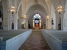Växjö Cathedral is a hall church, with nave and aisles of equal height.[48] It is three bays wide and four bays long.[49] The interior is painted white and uniformly lit by windows of approximately equal size, all except one dating from the 1950s renovation.[50] The ceiling is supported by 13 vaults, of which 7 are medieval. The medieval vaults are mostly located in the westernmost part of the church.[51] Traces of medieval murals have been restored in the south-west corner (the former chantry chapel).[18]