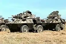 Relatively large-gunned variants of the V-100 began appearing in 1964, when Cadillac Gage marketed the Commando against the Alvis Saladin and Panhard AML-90 for a Royal Saudi Army requirement specifying a wheeled armoured vehicle equipped with a large semi-automatic cannon.[16] A number of V-150s were later successfully tested and offered with a Mecar low-pressure 90mm smoothbore gun. With the new turret and gun, the V-150 was manned by a crew of three, although it retained enough space for eight additional passengers if no additional shell racks were added.