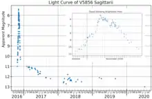 V5856 Sagittarii, also known as Nova Sagittarii 2016 Number 4, was the 4th and brightest nova that occurred in the constellation Sagittarius during 2016. It was discovered by the All Sky Automated Survey for SuperNovae (which assigned to it the name ASASSN-16ma) on 25.02 October 2016, at which time it had an apparent visual magnitude of 13.7.[7] It was independently discovered by Yukio Sakurai of Mito, Ibaraki, Japan on 26.38 October 2016, by which time it had reached magnitude 10.4.[8] It reached its peak brightness of magnitude 5.4, making it visible to the naked eye, on 8 November 2016.[4] The nova occurred within a region of the sky monitored by the OGLE microlensing experiment, and that group reported that no star brighter than magnitude 22 (I band) was seen at the nova's position prior to its eruption.[1]