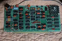 The Processor Technology VDM-1, for Video Display Module, was the first video card for S-100 bus computers.[1] Created in 1975, it allows an S-100 machine to produce its own display, and when paired with a keyboard and their 3P+S card, it eliminates the need for a separate video terminal. Using a 7 x 9 dot matrix and ASCII characters, it produces a 64-column by 16-row text display.