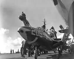 VF-52 was assigned to Carrier Air Group 5 (CVG-5) on board the USS Valley Forge and was deployed to the Western Pacific and Korea from 1 May to 1 December 1950. VF-52 along with VF-51, where the first Navy jet squadrons to see combat.[2] On 18 November 1950 VF-52 pilot LtCom William E. Lamb was credited with shooting down a Korean People's Air Force MiG-15, this was the Navy's second jet vs jet kill.[3]