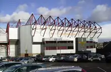 On 17 March 1932, Bradford City paid Midland Railway Company £3,750 for the remaining two-thirds of the site to become outright owners of the ground, which was now 45 years old.[20] The stadium had remained virtually unchanged since 1908, and did so until 1952,[9][17] when the capacity of the ground was reduced after examinations of the foundations were ordered following the 1946 Burnden Park disaster. The investigation resulted in the closure of half the Midland Road stand. The stand's steel frame was then sold to Berwick Rangers for £450 and a smaller replacement stand was built at Valley Parade in 1954.[20] Six years later, the stand had to be demolished for a second time because of continuing foundation problems.[21] It was another six years before all four stands at Valley Parade were able to be opened for the first time. To enable construction of a new stand on the Midland Road side of the ground, the club directors moved the pitch 3 yards (2.7 m) closer to the main stand. The new stand was then the narrowest stand in the league.[21] Further improvements were made to the stand in 1969, ready for the club's FA Cup tie with Division One side Tottenham Hotspur on 3 January 1970,[21] which ended in a 2–2 draw in front of 23,000 fans.[22] The cost of the work forced the club to sell Valley Parade to Bradford Corporation for £35,000, but it was bought back by 1979 for the same price.[23]