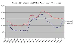 Official attendance figures for league games were not kept by The Football League until 1925. City's official highest average attendance at Valley Parade since then is 18,551 for the 1928–29 promotion season from Division Three (North),[79] although the club reported an average of 22,585 in 1920–21.[80] It was not until City were promoted to the Premier League in 1999 that the club again recorded average attendances of higher than 18,000. City recorded an average of 18,030 in 1999–2000, and 18,511 the following season.[81]