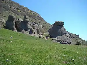 This legend portrays the story of how Crimean conquerors - nomads - came to the land.[22] The residents named the mountain "Funa" because post-fire steam and lights regularly came out from the top of the mountain. The blacksmith who delegated as the nomad by conquerors set up a huge forge on the mountain which became a workplace to create weapons and start using it to enslave the locals. Strongest men in the village were all taken into the forge. When people from the village worked to exhaustion and even some died, they went to the blacksmith to ask him to leave the mountain. The blacksmith responded by killing them all by fire. A girl called Maria decided to go to the blacksmith alone again. She quietly snuck into the smithy one night and asked the Blacksmith to leave the mountain. The blacksmith refused and commanded Maria to stay with him. In response, Maria pushed him strongly straight to the furnace. The blacksmith grabbed a dagger and killed the girl. The mountain itself could not tolerate this anymore, so it swallowed blacksmith together with his men (the nomads) and carried people from the valley to their original homes by wind. When the flames were extinguished and the dust settled, an extraordinary scene was there. Towering stone statues of unknown monsters - they were ugly similarities of a blacksmith and his henchmen - were on the mountain. On the highest point of the mountain, there was a rock, looked like the girl Maria - the latest victim of a brutal blacksmith. From that time Funa was extinguished, no fire is ever seen over the top. People who knew the story gave the mountain a new name - Demerdzhi, which means "smith".[23]