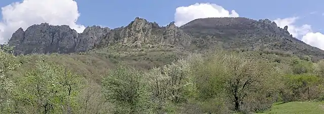 "Stone figures", which were formed by the weathering of rocks on the southwest slope of Demerdzhi Mountain, are called The Valley of Ghosts. It has been affected by several rock falls, notably in April 1894 and August 1966. The mountain Demerdzhi gets its mystery from the haze which changes its colors. In the Middle Ages, the mountain had the name 'Funa', which means "fuming", because of frequent fog.[4] The Valley of Ghosts was located on the slopes of Demerdzhi Castle and its remains have survived until now. There is a road which leads to the castle near the Valley of Ghosts .[5] Near the village of Funa, there are the ruins of Demerdzhi Castle, dating back to 13th - 15th centuries. The castle was an outpost of the Principality of Theodoro, where a small garrison prevented the penetration of the Genoese into Tavria. There was also a towered two-story church where a family vault is located.[6]
