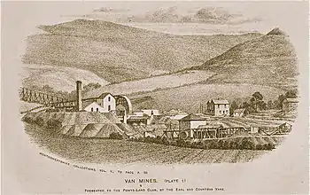 The hamlet grew in the 19th century with the discovery of large deposits of lead, and a thriving lead mine was developed. At one point during the late 19th century 'Van Mine' was the most productive in Europe. The mines declined under pressure from foreign imports in the early 20th century plus mis-management, and operations ceased in the inter-war period. The name Van is also given to the small lake located just outside the village, Van Pool (Welsh: Pwll y Fan).