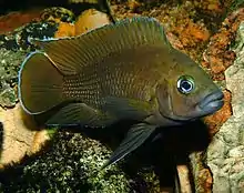 Variabilichromis moorii has no common name and is a species of freshwater cichlid endemic to Lake Tanganyika in eastern Africa. It is a small ovate bodied fish named for an early collector of fish from the lake, John Edmund Sharrock Moore (1870-1947) who was a cytologist, zoologist and led an expedition to Lake Tanganyika and who discovered this species.[2] Juveniles are usually yellow, and adults are dark brown to black in color.[3] It reaches a total length (TL) of 10.3 centimetres (4.1 in). Currently it is the only member of its genus. V. moorii feeds on algae, zooplankton, and benthic invertebrates. It is also found in the aquarium trade.[4]
